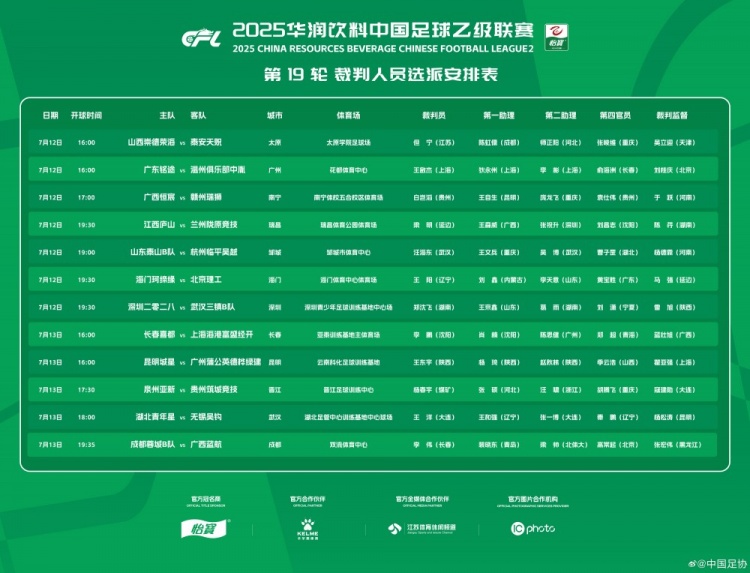 7月12日,中国足协正式发布了中甲联赛第16轮及中乙联赛第19轮的裁判员选派名单。